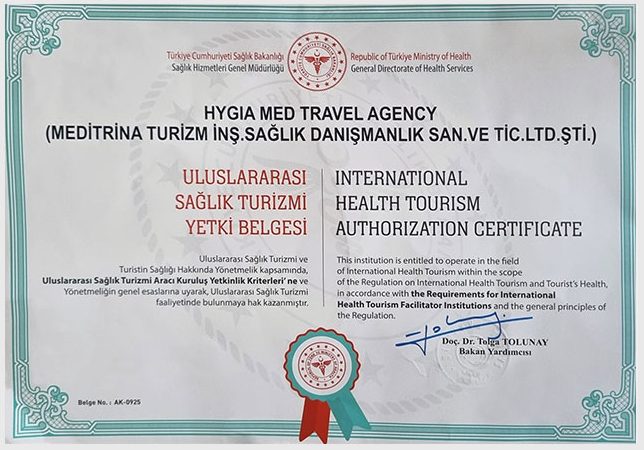 Hygia Med is an intermediary company of Meditrina Tourism Health Consultancy Limited Company; accredited and audited by Republic of Turkey Ministry of Health. Hygia Med Health Travel Agency aim to deliver the best results by combining the 101 years of experience accumulation of Republic of Turkey Ministry of Health with modern and up to date; both visually and technically hospitals and health services infrastructure and experienced doctors. Cooperating with the doctors who specialize and have an outstanding success in their own field and accommodating our patients in the most modern hotels/hospitals are only some of the reasons why as Hygia Med; we are considered as a five-star medical tourism company. We provide accurate diagnosis and accordingly correct medical treatment in the hospitals with the comfort of a 5-star hotel; with the doctors who have proven themselves with their experience. We are committed to provide high performance and quality service at a reasonable price. As Hygia Med, we provide various treatment services for our valuable patients, where we take care of you from the moment you arrive in Turkey until the moment you fly back home. In addition, our patients get the TURKEY EMERGENCY HEALTH CARD, a health insurance with a coverage of up to 30.000 € , free of charge, against "sudden discomfort and diseases", that may occur outside of the treatment booked with us.